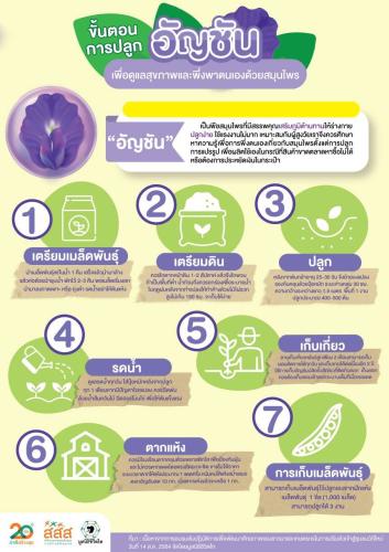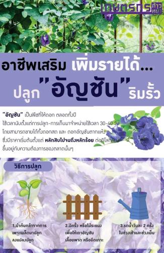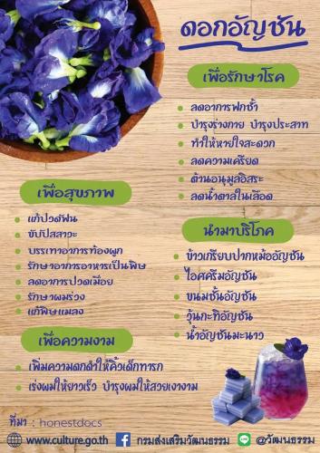 “อัญชัน” เป็นพืชสมุนไพรที่มีสรรพคุณเสริมภูมิต้านทานให้ร่างกาย ปลูกง่าย ใช้แรงงานไม่มาก เหมาะสมกับผู้สูงวัย ในการปลูก หรือ แปรรูป ใช้ในครัวเรือน และจำหน่าย ทำให้มีอาชีพเสริม รายได้เพิ่ม เช่น ดอกอัญชันตากแห้ง ชาดอกอัญชัน